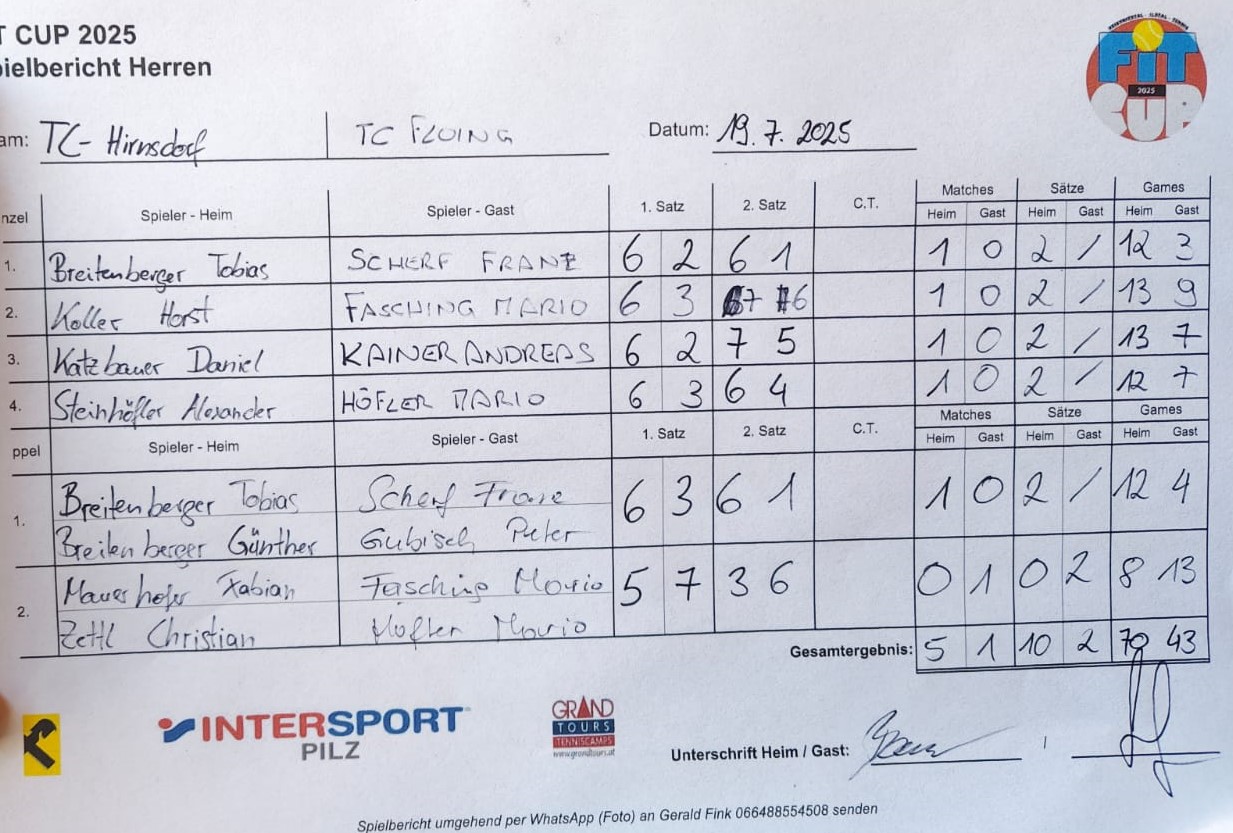 SG Hirnsdorf-Kaibing vs TC Union Floing 16. April 202521. Juli 2025 gerald Kalender Tabelle 19-07-2025 5. Runde SG Hirnsdorf-Kaibing TC Union Floing 51 Überblick Fotos Spielstatistik 10 Sätze 2 70 Games 43