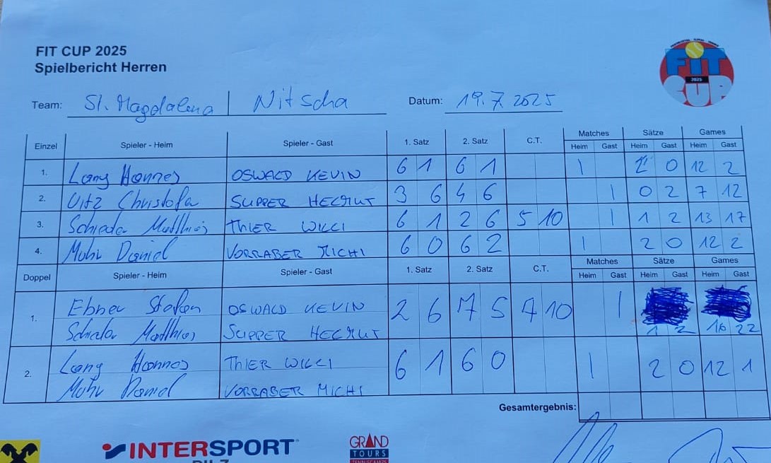TC St. Magdalena vs TC Nitscha 29. März 202521. Juli 2025 gerald Kalender Tabelle 19-07-2025 5. Runde TC St. Magdalena TC Nitscha 33 Überblick Fotos Spielstatistik 8 Sätze 6 73 Games 56